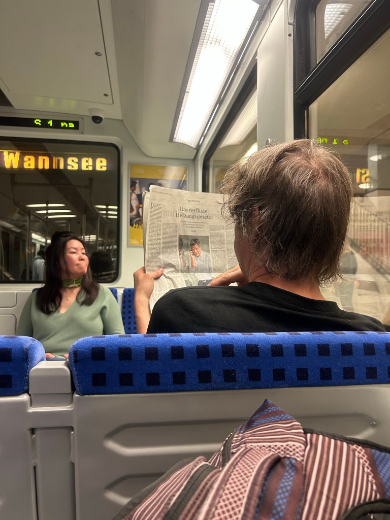 alb 1 geht es direkt vom einen Hybrid-Meeting in das nächste, anderer Meetingraum, mit insgesamt fünf anderen vor Ort in einem Raum für 4, weil in dem größeren die Technik steigt, und Leuten aus Nordberlin, Dublin und Valencia zugeschaltet. Wir überziehen um eine halbe Stunde und dann ist die Luft auch mehr als verbraucht. Soviel zu den Learnings aus der Pandemie. Zurück am Platz packe ich meine Sachen wieder ein, schließe die Sporttasche weg und mache mich dann mit U- und S-Bahn auf den Weg nach Südberlin.