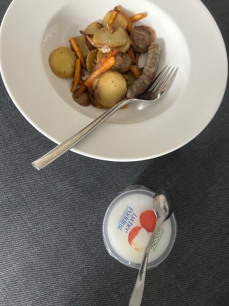 In der leeren Wohnung des Liebsten mache ich mir die vorgefundenen Reste von Abendessen warm – gebratene Kartoffeln und Möhren und ein einsames Nürnberger Würstchen, esse den letzten Litschi-Kokospudding aus dem Kühlschrank, telefoniere kurz mit meinen Eltern und setze mich dann wieder an die Arbeit.