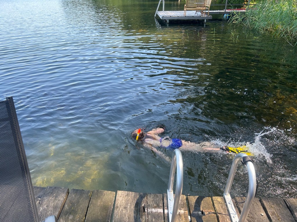 Danach zieht es uns dann aber endlich ans Wasser und wir nehmen Position auf dem Steg ein. Es wird gebloggt, gelesen und erzählt und beim Baden kommen heute auch Schwimmflossen, Taucherbrillen, Paddle Boards und Kescher zum Einsatz.