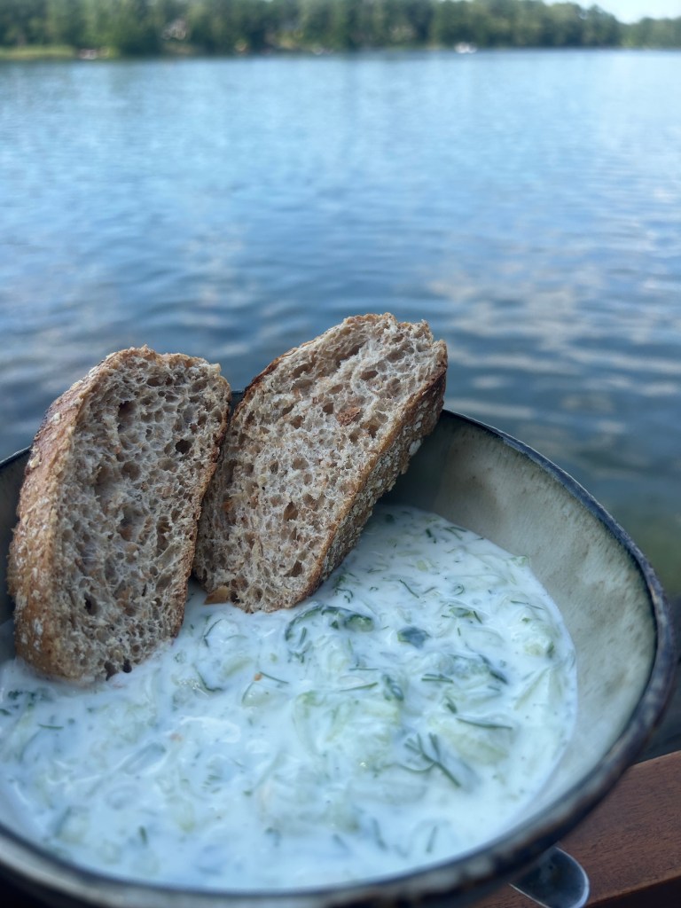 Der Liebste und mein Bruder fahren nochmal kurz los, Pfand abgeben und letzte Dinge einkaufen. Ich schwimme eine ganz ordentliche Strecke, nur um hinterher festzustellen, dass das so gar nicht auf mein Schrittziel einzahlt, hmpf. Am frühen Nachmittag servieren mein Bruder und seine Freundin eine kalte Joghurt-Gurken-Suppe mit ordentlich Dill und Knoblauch, die bei der Hitze genau das Richtige ist.