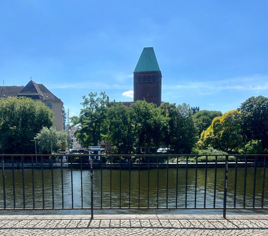 Im Büro trinke ich erst einmal viel Wasser, dann stöpsle ich meinen Laptop an und gehe in die Küche, Milch ins mitgebrachte Müsli mit Aprikosen gießen und meine Wasserflasche auffüllen. Bis 11 Uhr dann entspanntes Abarbeiten und Sachen sortieren und danach ein gut anderthalbstündiges Meeting – drei vor Ort, zwei zugeschaltet aus Lichtenberg und Biesdorf. Hinterher noch kurzes Nachbereiten und dann mache ich 13 Uhr Mittagspause. Heute habe ich mal Lust auf was Anderes und spaziere über den Fluss in den Westen (eigentlich Süden, Kreuzberg halt). Dort hole ich mir in einer Bäckerei bei der C-Base ein Körnerbrötchen mit Serrano-Schinken und damit setze ich mich dann zurück im Osten auf eine Bank mit Spreeblick.