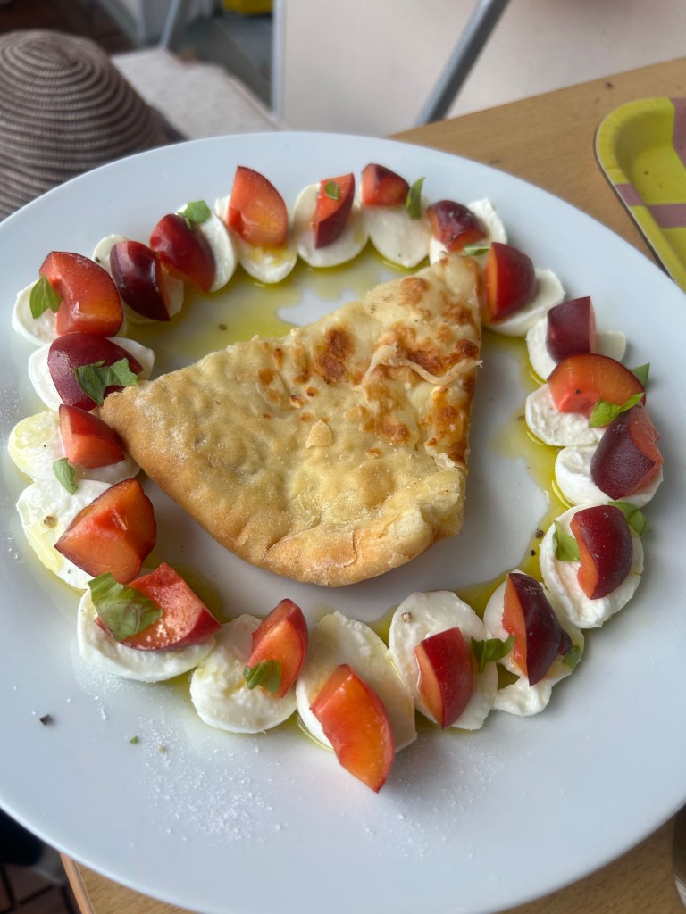 Jetzt stehen erste Besorgungen des Tages an. Ich laufe zur Änderungsschneiderei und hole das Kleid ab, das mir neulich beim aus der Waschmaschine Holen gerissen ist. Sieht von außen wie neu aus, von innen hat es einen Flicken. Ob man den spürt, werde ich wohl am Wochenende feststellen. Dann geht es weiter zum Haustierbedarf. Ich brauche Katzenstreu- Nachschub und anscheinend wird meine Sorte nicht mehr geführt, weder online noch im Laden. Also suche ich mir einen Ersatz aus und werde den dann demnächst mal vorsichtig einschleichen und bei Erfolg größere Mengen online bestellen. Außerdem kommt noch ein Vorleger für das Balkonklo mit. Wieder zuhause bastle ich mir ein schnelles Mittagessen – Insalata Caprese mit Büfflemozzarella und Aprikosen statt Tomaten – und ein weiteres Stück Khachapuri.