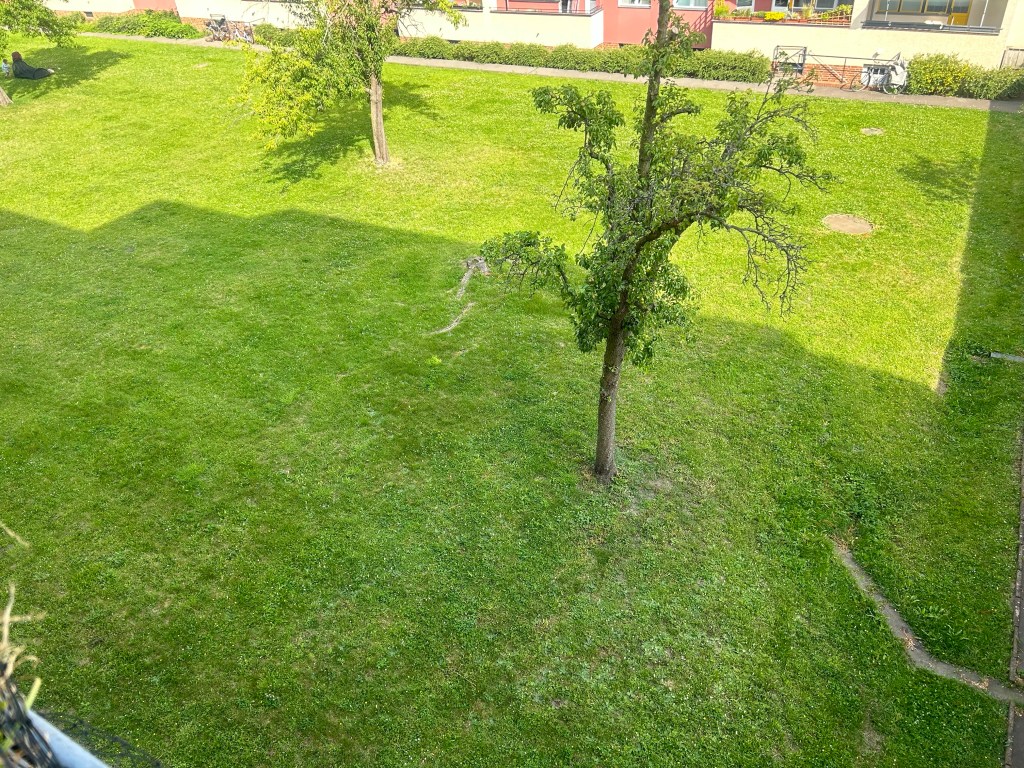 Den ersten Call des Nachmittags führe ich mit Nürnberg und Potsdam. Danach arbeite ich nochmal weiter an der E-Mail (plus weiteres Telefonat) und schicke sie raus. Außerdem kann ich nach Rücksprache mit Kolleginnen in Biesdorf und Madrid eine weiteres Projekt bis auf Weiteres abschließen. Zwischendurch checke ich mit Blick in den Innenhof die Schattensituation, am Sonnabend werden wir dort laut Wetterbericht bei 36 Grad sitzen, das scheint aber OK zu sein.