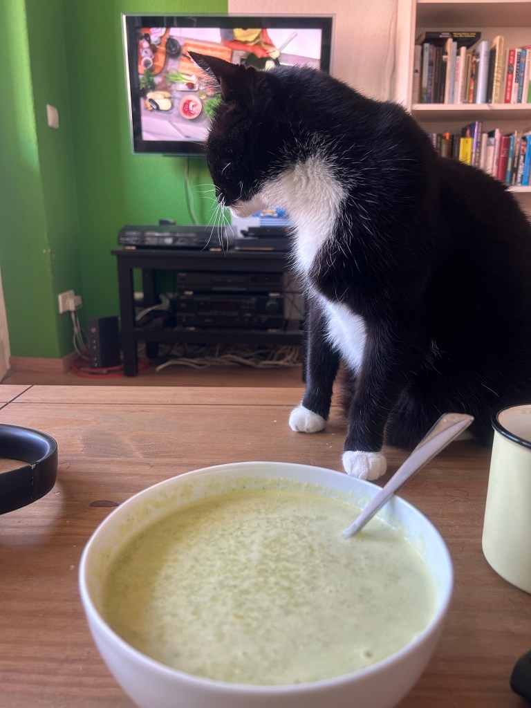 Danach lade ich dann erstmal Telefon und Kopfhörer auf und telefoniere mit meinen Eltern. Wir bringen uns auf den neusten Stand und stimmen Termine ab. In anderen Familien-News ist mein Bruder gut im Yukon angekommen und meine Oma wäre heute 101 geworden. Nach dem Telefonat mache ich mir Abendbrot. Es gilt Reste aufzubrauchen und dabei möglichst histaminfrei zu bleiben. Besonders kreativ bin ich dabei aber nicht und ob es angesichts des „Reste“-Vorzeichens wirklich so histaminfrei ist, ist auch noch die Frage. Wirklich leicht verdaulich ist es dann jedenfalls nicht, wie ich feststellen darf: Ich werfe ein zerkleinertes und in Wasser eingeweichtes altbackenes Brötchen mit einer kleinen Zucchini, einer gelben Paprika, einer grünen Paprika, einer Zehe Knoblauch, einem Schwapps Olivenöl und einer großzügigen Prise Meersalz in den Mixer und habe dann zwei große Schüsseln voll Gazpacho zu löffeln/trinken. Dabei entspanne ich mich soweit, dass ich das erste Foto des Tages mache. Im Hintergrund läuft die sehr unterhaltsame „Böhmi brutzelt“-Folge mit Anke Engelke. Beide Gerichte darf ich derzeit nicht essen, hmpf.