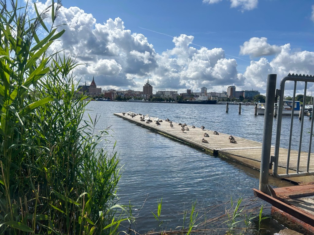 Und dann bin ich am Fähranleger und bekomme venezianische Gefühle, als ich mit dem mit Solarstrom betriebenen „Warnowstromer“ vaporettoähnlich zum Stadthafen übersetze. Gehört ganz normal zum ÖPNV und ist damit auch in meinem 49-Euro-Ticket enthalten. Tatsächlich habe ich diese Fähre in über 20 Jahren regelmäßiger Rostock-Aufenthalte (inklusive 6 Jahre hier wohnen und plus diverser Kindheitsausflüge) vorher maximal einmal benutzt – als sie noch nicht solarbetrieben war jedenfalls. Ich war aber auch überhaupt sehr selten auf dieser Warnowseite, mal eine Tante in der Klinik hier besucht, mal von hier aus losgesegelt, mal durchgefahren, um Richtung Markgrafenheide oder auf den Darß zu kommen, das war’s. Mein komplettes Rostock-(Er-)Leben spielte sich südlich und westlich der Warnow ab, bis mein Cousin jetzt auf diese Seite zog. Danke, Cousin, für diesen Morgenspaziergang hat sich das schonmal gelohnt. 😉