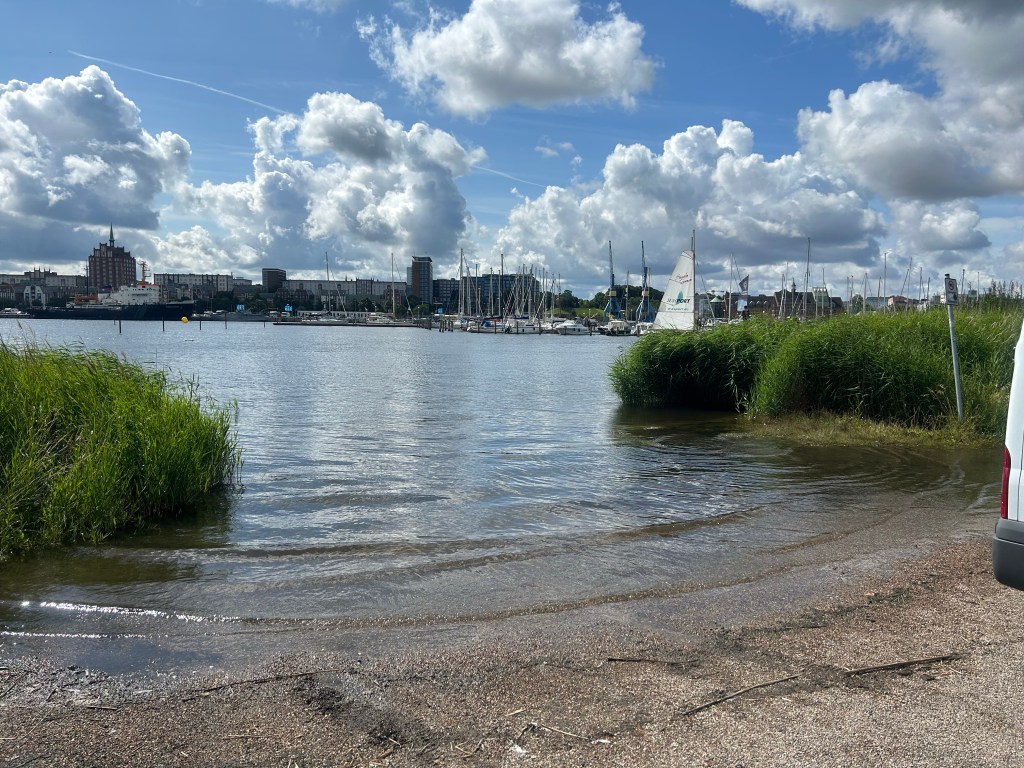 Ich laufe als erstes einmal direkt runter zur Warnow und dann durch grüne Wiesen am Fluss entlang Richtung Nordwesten, das Stadtzentrum gegenüber immer fest im Blick. Dann komme ich nach Gehlsdorf, wo sich die verschiedenen Wassersportvereine mit ihren Marinas, die nur für Mitglieder und deren Gäst*innen zugänglich sind, aneinanderreihen und freue mich an der deutschen Vereinsmeierei durch die Epochen: Rostocker Ruder-Club von 1885 e.V., See- und Segelsportverein der Hansestadt Rostock e.V., Mecklenburgischer Yachtclub Rostock e.V., Rostocker Yachtclub e.V., Segler-Verein Turbine Rostock e.V., Akademischer Segler-Verein zu Rostock e.V. Dahinter kommen noch ein paar Stadtvillen und Grünfläche, auf dem Fluss kraulen die Teilnehmenden des „Warnowschwimmen 2023“, begleitet von Schlauchbooten und Kajaks der DLRG, an mir vorbei.