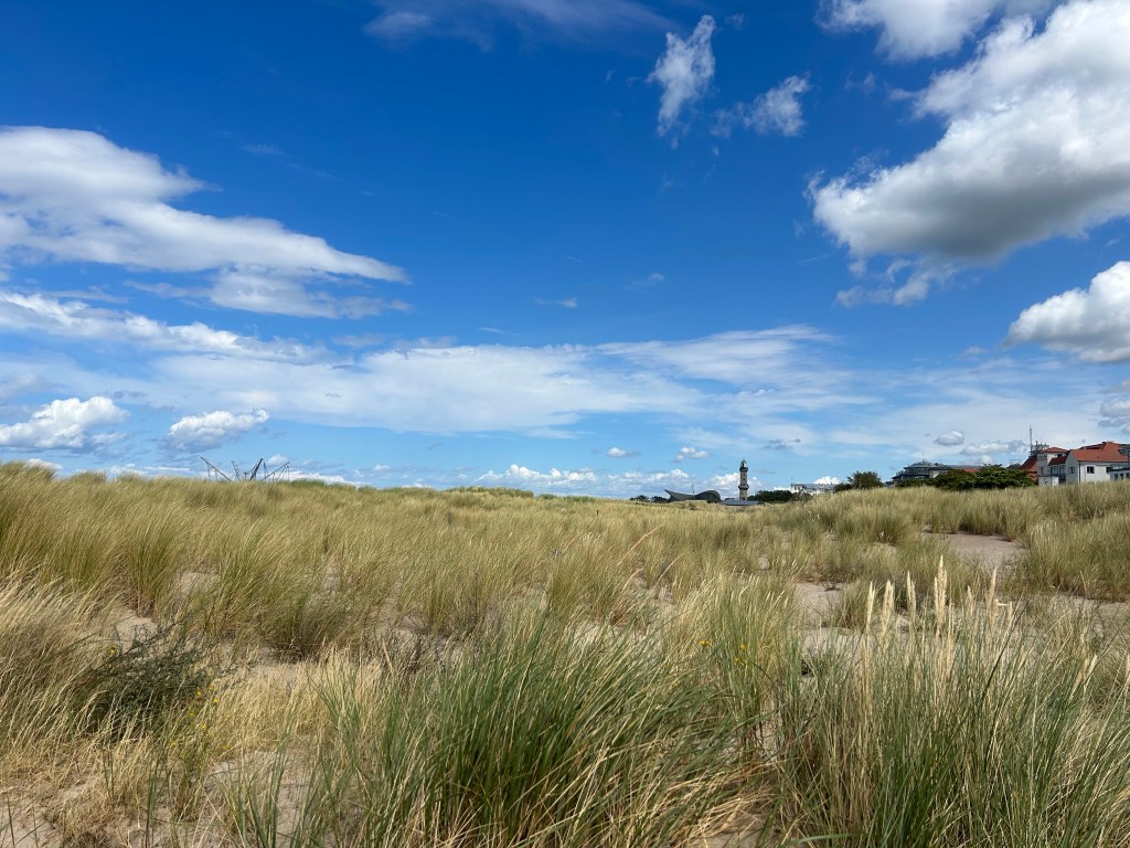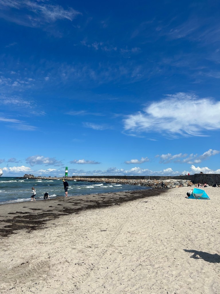 Das Wetter ist maritim-wechselhaft. Strahlendblauer Himmel und Wolken in schneller Folge, um die 20 Grad aber kalter Wind. An gefährlichen Stellen mit Strömungen ist das Schwimmen verboten, aber auch die anderen Flaggen sind gelb-rot bis orange und es sind nicht allzu viele Leute im Wasser. Ich spaziere mit den Füßen im Wasser ein Stück Richtung (Hotel) Neptun und lege mich dann gemütlich in den Sand und tanke Vitamin Sea. Wind, Gischt, Möwengeschrei, Salz- und Algenduft in der Nase und feiner Warnemünder Strandsand zwischen Fingern und Zehen.