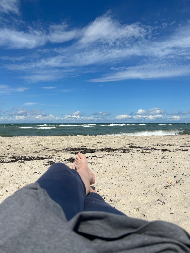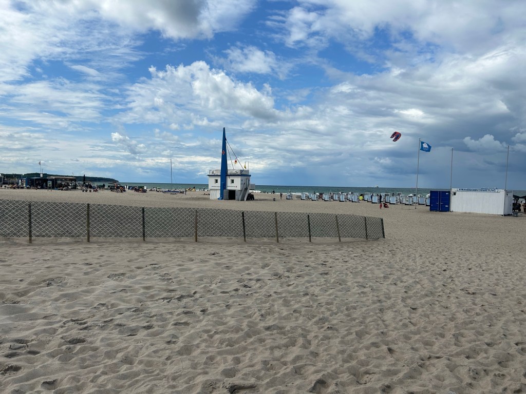 Eine gute Stunde liege ich da, mache zwischendurch auch mal die Augen zu und döse. Irgendwann ist die Wolkendecke zu groß und es wird mir zu kühl zum Liegen. Ich laufe noch ein Stück durchs Wasser und dann zurück Richtung Promenade und komme an dem Strandaufgang hoch, den ich sowohl als Kind als auch als Studentin immer benutzt habe.