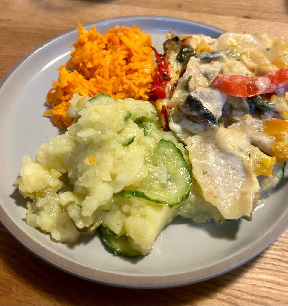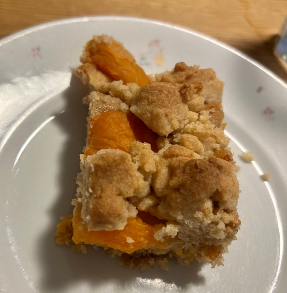 Es wird eine große Runde heute Abend. Zu meinem Cousin, seiner Freundin, der Hündin und mir stoßen noch sein Bruder – mein Couin – mit dessen Freundin, sein Vater – mein Onkel – mit dessen Freundin, ein anderer Freund aus Rostock und zwei Freund*innen aus Berlin. Wir essen Gemüselasagne, Möhrensalat (beides für mich jeweils in einer histaminarmen Variante als Extraportion), Kartoffelsalat und Aprikosenkuchen (für mich ohne Eis und Vanillesauce).