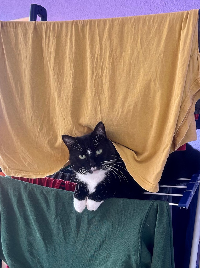Ich erwache vor dem Wecker, aber nicht zu früh, und kann alles Morgendliche (Internet leer lesen, Bloggen, Sprachen üben, mit dem Liebsten telefonieren, Pflanzen gießen, Katzen füttern) in entspannter Ruhe erledigen. Zum Frühstück koche ich mir Grießbrei, dazu gibt es einen Pfirsich und den Rest Quittensaft kippe ich mir in meine Kanne Kräutertee. Eigentlich könnte ich noch die Wäsche abnehmen, aber die funktioniert gerade wieder als Noosa-Höhle.