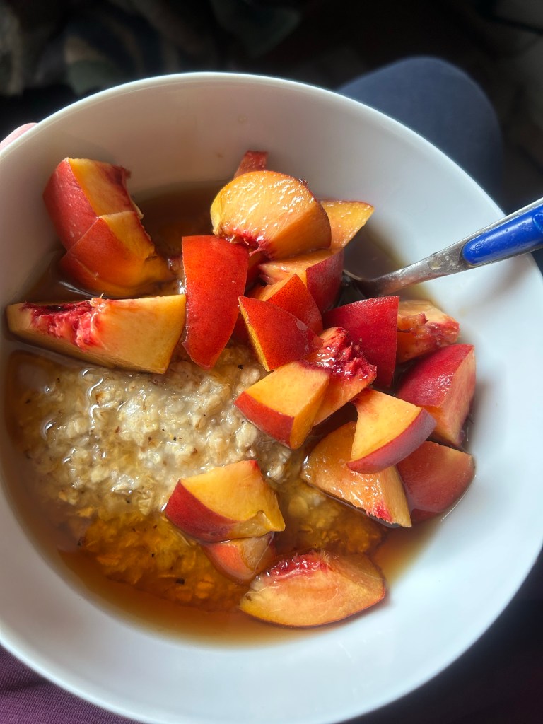 Später am Schreibtisch gibt es dann Porridge („for the people“) mit dem letzten Pfirsich (Resteessen) und dem letzten Ahornsirup (Wir müssen wieder nach Kanada!) und normalen Pfefferminztee. Ich telefoniere kurz mit dem Liebsten und arbeite mich dann durch die über Nacht aufgelaufenen E-Mails. Danach kleiner Meeting-Marathon – erst zu dritt mit Warschau und Prag, dann zu viert mit Mitte, Lichtenberg und Wilmersdorf. Hinterher rufe ich den Liebsten zurück, der sich zwischendrin nochmal gemeldet hatte. Dann kurzer Schnack mit dem Mitbewohner in der Küche und während ich die (letzte) Wäsche (vor dem Urlaub) aufhänge.
