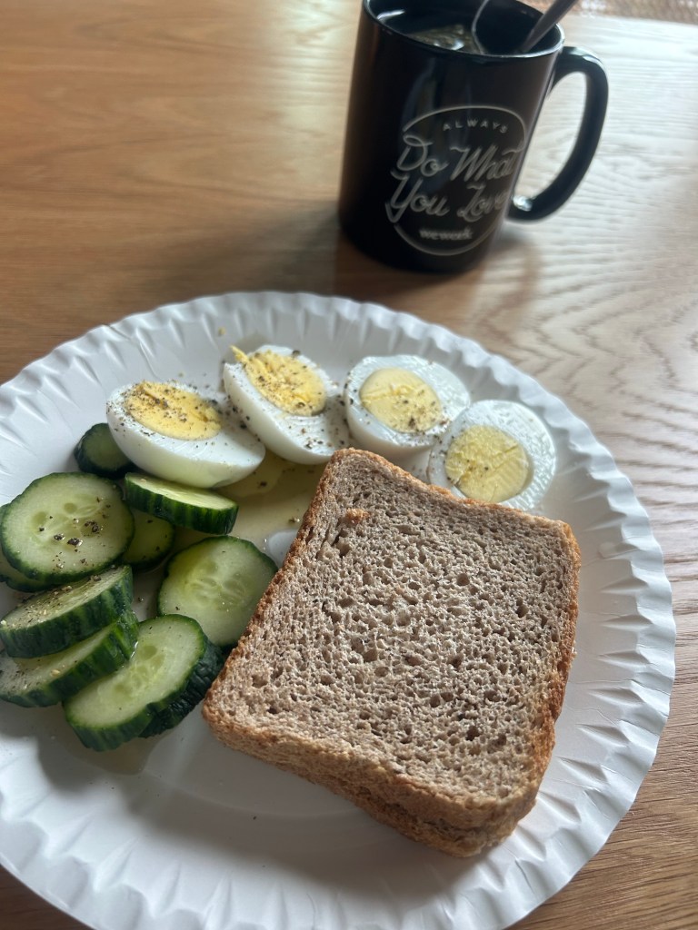 Aber ich laufe eigentlich ganz nett von der Praxis durch Moabit, über die Spree ins Hansaviertel zum S-Bahnhof der Stadtbahn. Nebenbei schreibe ich bereits mit einer Kollegin in Warschau. Kurz nach 11 bin ich im Büro, baue meinen Laptop auf und hole mir einen Kräutertee. Ähnlich wie gestern besteht der heutige Bürotag aus vielen informellen Besprechungen und Telefonaten und langen allgemeinen Gesprächen – ich habe dank Urlaubszeit kein einziges Meeting. Mittags gibt es Stulle mit Ziegenfrischkäse, zwei hartgekochte Eier und Gurke.