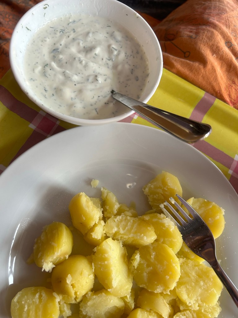 Der Laptop ist zum Glück trocken geblieben. Den klappe ich auch gleich wieder auf, denn auf dem Diensthandy habe ich bereits eine E-Mail mit Handlungsbedarf gesehen. Zwischen Kräuterquark anrühren (Leinöl ist alle) und Kartoffeln pellen stimme ich mich mit Kolleg*innen auf drei Kontinenten ab. Beim Essen, das ich im Bett einnehme, um mich aufzuwärmen, telefoniere ich ein viertes Mal heute mit dem Liebsten.
