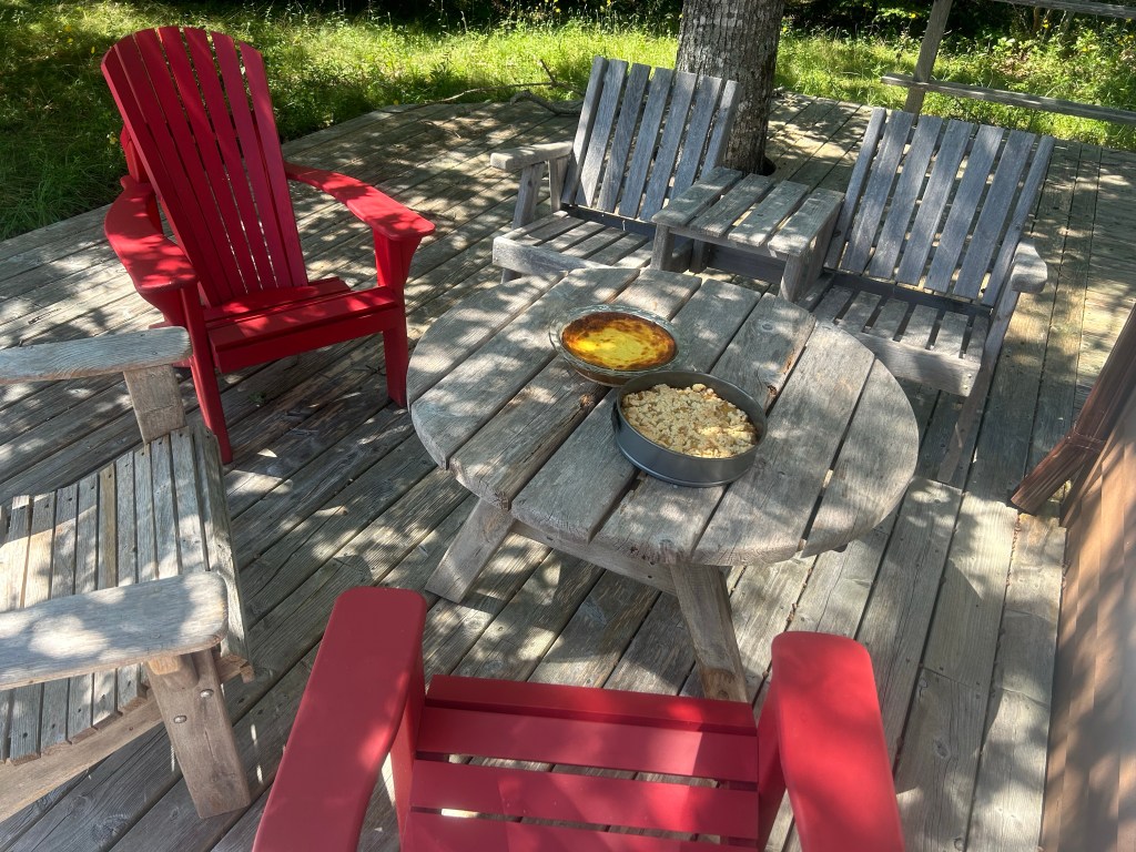 Dann werde ich auf einmal ganz schön müde – ich bin seit 8 Stunden wach. Ich ziehe mich aufs Sofa zurück und schlafe fast zwei Stunden, während der Liebste liest und das Teilzeitkind mit meiner Mama Kuchen bäckt. Irgendwann piept der Ofen und meldet Vollzug. Wir decken den Tisch auf dem Deck und es gibt Quarktorte und Pflaumenkuchen mit Streuseln, dazu Eis, Kaffee und Tee.