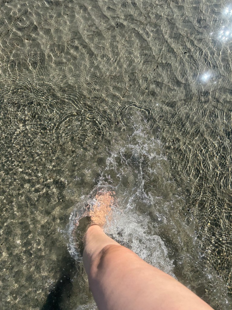 Nach dem Essen machen wir drei uns strandfein und fahren etwa eine Viertelstunde die Küste entlang zu einem Strand. Erst sind wir sehr optimistisch – es ist warm, es sind einige Leute im Wasser – und schicken uns an, Baden zu gehen. Wir merken dann aber sehr schnell, dass das Wasser eisekalt ist. Angeblich 16 Grad, aber es fühlt sich kälter an. Also ziehen wir uns unsere Oberteile wieder an und gehen nur bis zu den Knien rein. Der Liebste und das Teilzeitkind tummeln sich im Wasser, ich laufe den Strand einmal von Ende zu Ende ab, nähere mich meinem Schrittziel, atme tief ein und starre aufs Wasser. Und mache Fotos.