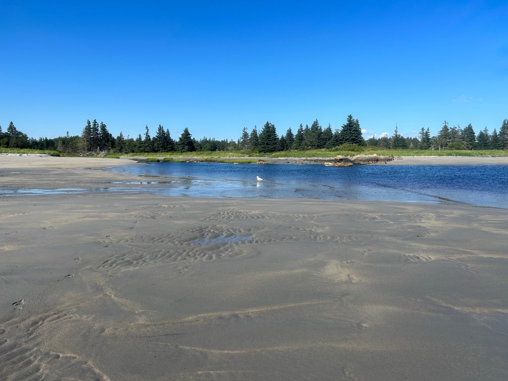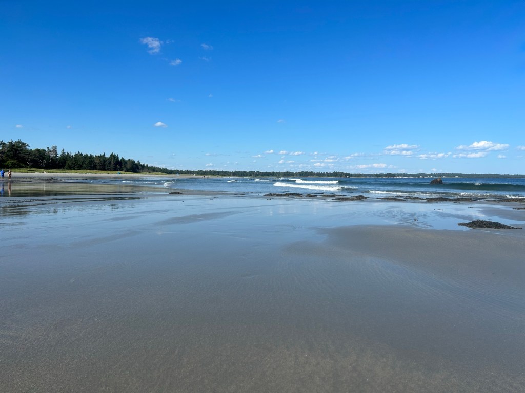 Ich wache nach nur fünf Stunden auf – es ist 4 Uhr morgens bzw. 9 Uhr morgens in Deutschland. Draußen ist es noch dunkel und still, aber ich rieche den Holzduft, den dieses Haus auch nach über 20 Jahren verströmt und weiß, dass ich gut aufgehoben bin. Erst lese ich, um wieder einzuschlafen, dann versuche ich es mit Podcast hören – allerdings mit Kopfhörern auf, um den Liebsten nicht zu wecken und das bedeutet auf dem Rücken liegen, was bedeutet, nicht wieder einzuschlafen. Gegen 5 dann geht das Teilzeitkind aufs Klo, bleibt danach wach und hört Hörbuch – laut genug, dass ich im Nebenzimmer mithören kann. Einer Bitte um Leiserstellen wird entsprochen, aber endgültig wach bin ich jetzt doch. Ich lese das Internet leer und blogge. Gegen halb 7 wird der Liebste auch wach, dann stehe ich auf und mache Kaffee für ihn, Kräutertee für mich und Orangensaft für das Teilzeitkind, das dann auch nach meinem Handy verlangt, um zu spielen. Beim in der Küche Stehen sehe ich erstmals hinaus auf die Bucht – gestern war ja alles dunkel. Es ist noch diesig, der Himmel weiß, das Wasser grau. Aber es ist das Meer da draußen.