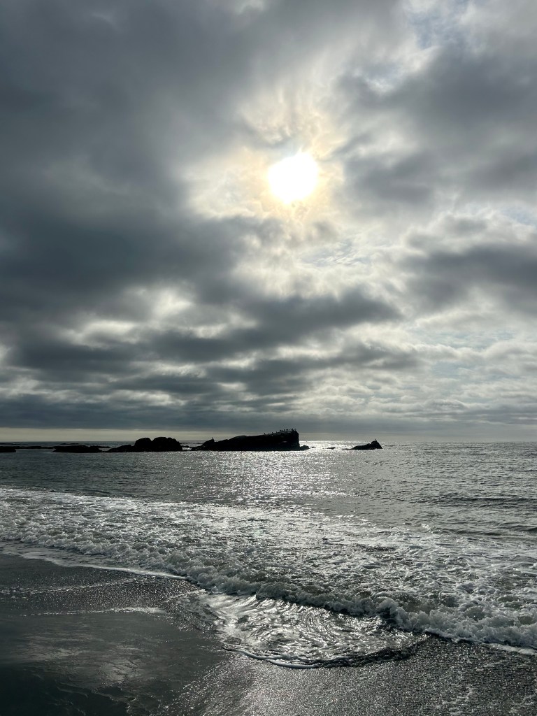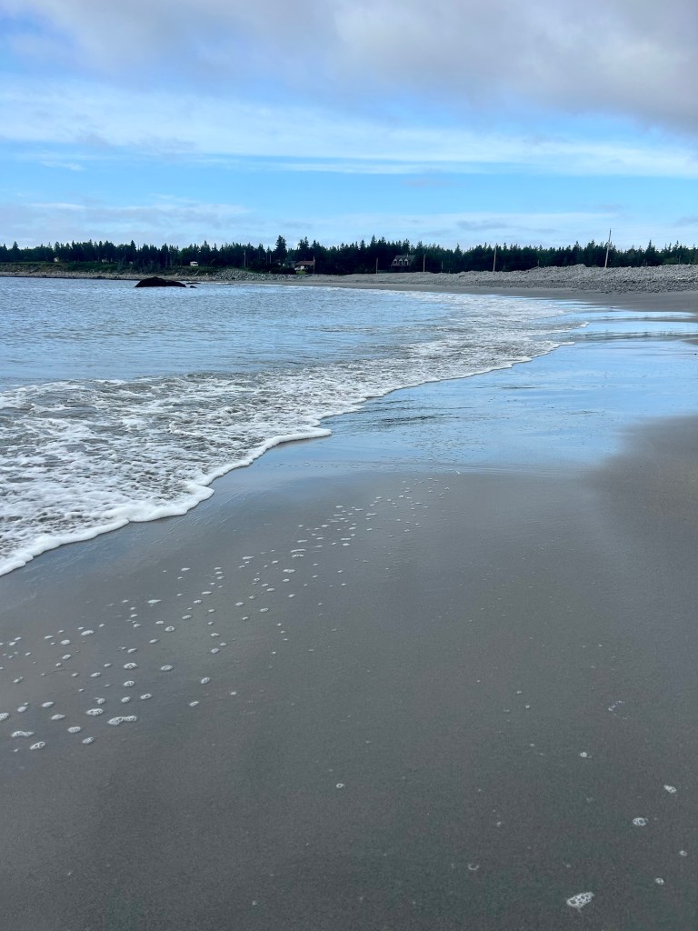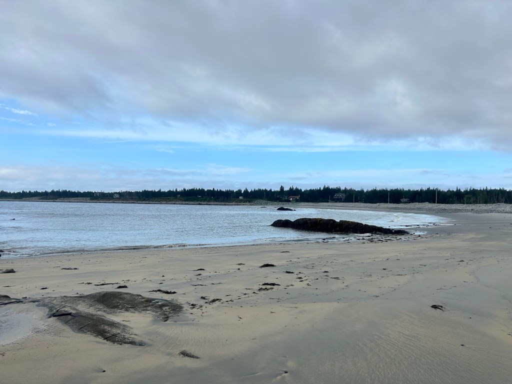 Ich erwache gut ausgeruht aber schon wieder um 6. Relativ kurz danach sind auch das Teilzeitkind und der Liebste wach und so beschließen wir gegen halb 8, wieder eine Vorfrühstücksrunde an einem Strand zu drehen. Meine Mama bäckt indes Brötchen fürs Frühstück. Wir fahren zu einem dritten schönen Strand in der Nähe. Der Himmel ist bedeckt, die anderen beiden ziehen sich nicht einmal die Schuhe aus, sondern klettern lieber über Felsen, während ich gemütlich durch die Brandung spaziere. Learning trotzdem: Für Strandausflüge festes Schuhwerk anziehen. Am Anfang musste man über rundliches Geröll steigen, was in Flipflops erstaunlich schlecht geht. Und Mückenspray brauchten wir hier auch, aber darauf waren wir vorbereitet.