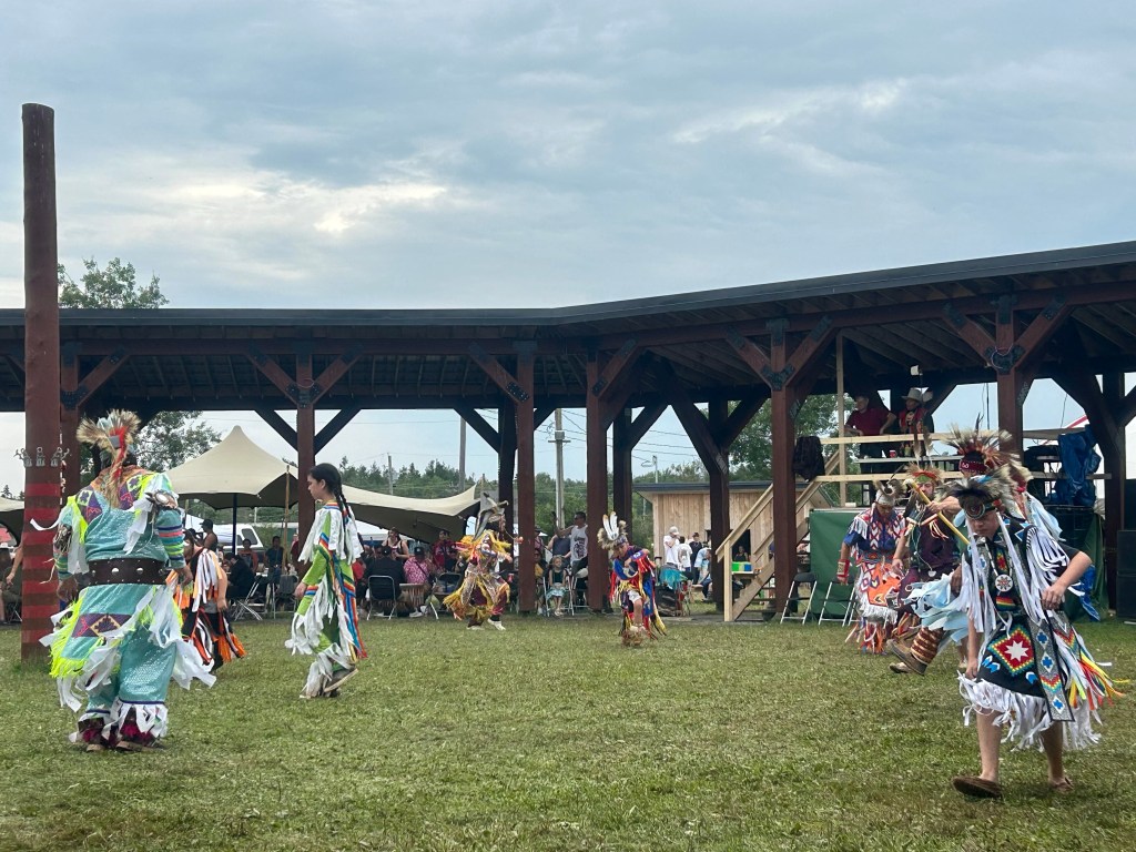 Nach etwa zwei Stunden erreichen wir die Millbrook 27 First Nation, ein Reservat der örtlichen Mi‘kmaq, wo heute der zweite Tag des jährlichen Powwows stattfindet. Wir haben noch etwas Zeit, bevor es offiziell losgeht und laufen erst einmal über das Gelände und schauen uns die verschiedenen Stände an, an denen Kleidung, Kunst, traditionelles Handwerk und Essen (Hotdogs, Burger, Poutine oder Lobster) verkauft werden. In der Mitte der schon leicht schlammigen Wiese (Wir vermeiden alle das R-Wort!) befindet sich ein ringförmiges Dach um den Tanzplatz, unter dem die verschiedenen Trommelgruppen, Tänzer*innen und Besucher*innen sich nach und nach einfinden. Der Liebste holt nochmal kurz was aus dem Auto, die Zeit nutzen das Teilzeitkind und ich dafür, uns erstmal Smoothies zu besorgen. Dann setzen auch wir uns unter den Dachring.