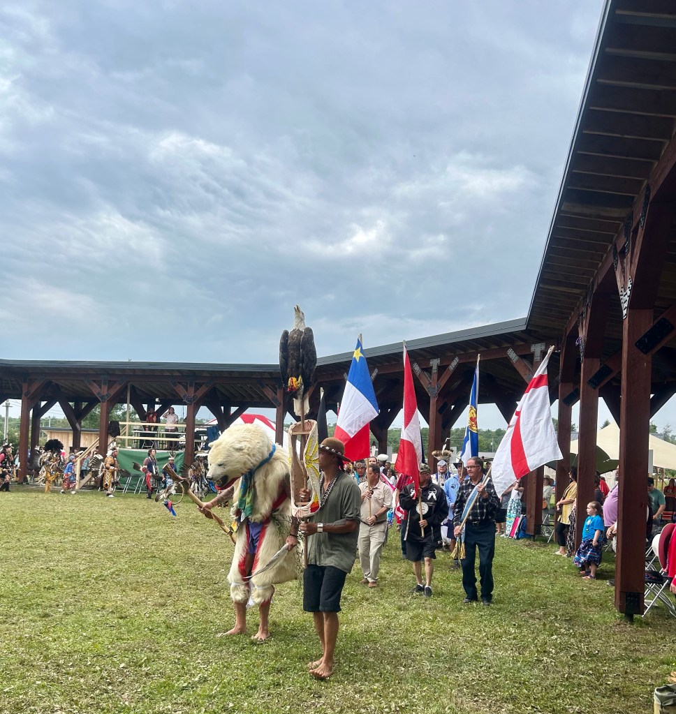 Dann beginnt der offizielle Teil des Powwows mit der Eröffnungszeremonie durch die Tänzer*innen, bevor die Flaggen hereingetragen und aufgehängt werden – die Flagge der Mi‘kmaq, die von Nova Scotia, die der Acadie, die von Kanada, die der USA, die der Streitkräfte und die der Veteran*innen. Währenddessen wird gestanden und den verstorbenen Ahnen, den Opfern der Kolonialisierung und den Gefallenen der Kriege gedacht. Dann gibt es einen speziellen Tanz, um anwesende Veteran*innen zu ehren.