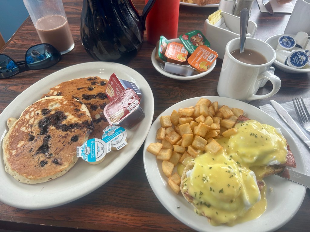 Wir packen schnell unsere Sachen zusammen, laden dem Teilzeitkind noch ein paar Hörspiele runter, solange wir noch WLAN haben, checken aus und halten dann gleich einen Kilometer weiter an einem unscheinbaren Diner, wo es dann aber ein hervorragendes Frühstück gibt. Es dauert lange und die Auswahl ist nicht so wahnsinnig groß, wenn man sich für süßes Frühstück oder etwa gar etwas Gesundes interessiert, aber was dann kommt ist wirklich, wirklich lecker.