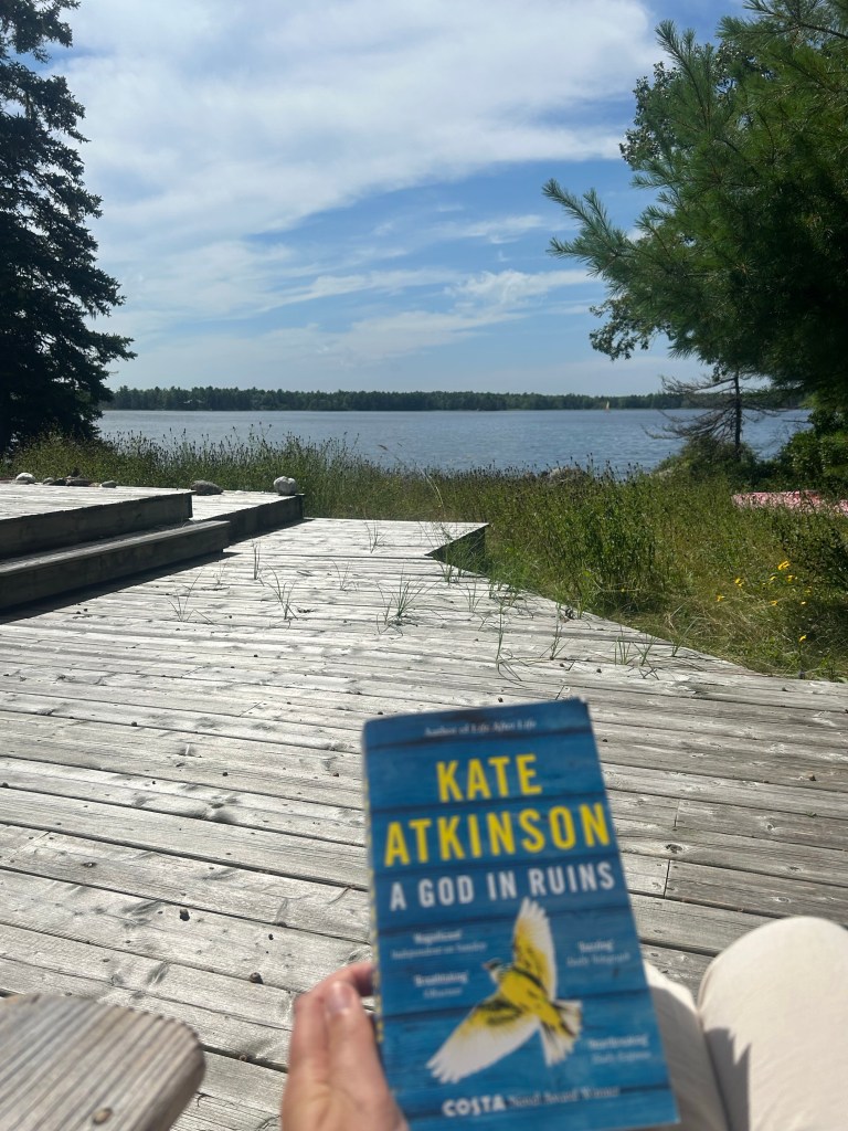 Heute müssen wir erst einmal exakt gar nichts. Wir schlafen aus, so lange wir können (bei mir heißt das gegen 7, aber ich war ja früh im Bett), trinken Kaffee/Kräutertee im Bett und bleiben gemütlich liegen, bis wir Hunger bekommen. Es gibt also dann gegen halb 11 Frühstück. Bis dahin hat sich auch der morgens bedeckte Himmel aufgeklart und ich setze mich mit meinem Buch raus auf die Terrasse in die Sonne. Allerdings ist genau dann die zweite Waschmaschine mit unseren Roadtrip-Klamotten fertig und ich stehe direkt wieder auf, um die auf der Wäscheleine auf der Waldlichtung aufzuhängen. Als ich zurück bin, ist es zu windig, um draußen sitzen zu bleiben, also lese ich drinnen weiter.