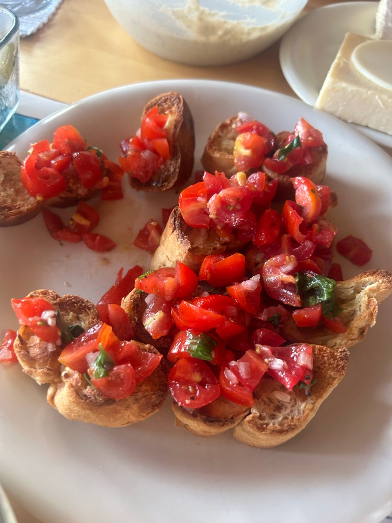 Irgendwann verschwinden Mama und Teilzeitkind in der Küche und machen Baba Ghanoush und Hummus, dann grillen wir Zucchini und ich kümmere mich um Bruschetta und Salat. Das Abendessen ist heute eine Art Antipasti-/Mezze-Buffet. Eine weitere willkommene Abwechslung nach all den Burgern und Pommes.