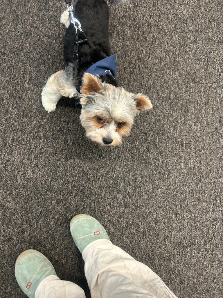 Eigentlich habe ich mir einen ziemlich entspannten Arbeitstag vorgestellt und eingeplant. Der Mittwoch ist ja neuerdings meetingfrei (bis auf dringende Ausnahmen) und ich will im Büro vor allem ein paar Kleinigkeiten erledigen, die nicht virtuell gehen (Papierunterlagen suchen und scannen, Dokumente ausdrucken, Inventur bei physischen Gegenständen machen), mich dazu auch einmal kurz mit zwei Kollegen treffen und ansonsten konzentriert an einer kreativen Aufgabe arbeiten. Der Bürohund begrüßt mich sehr erfreut.
