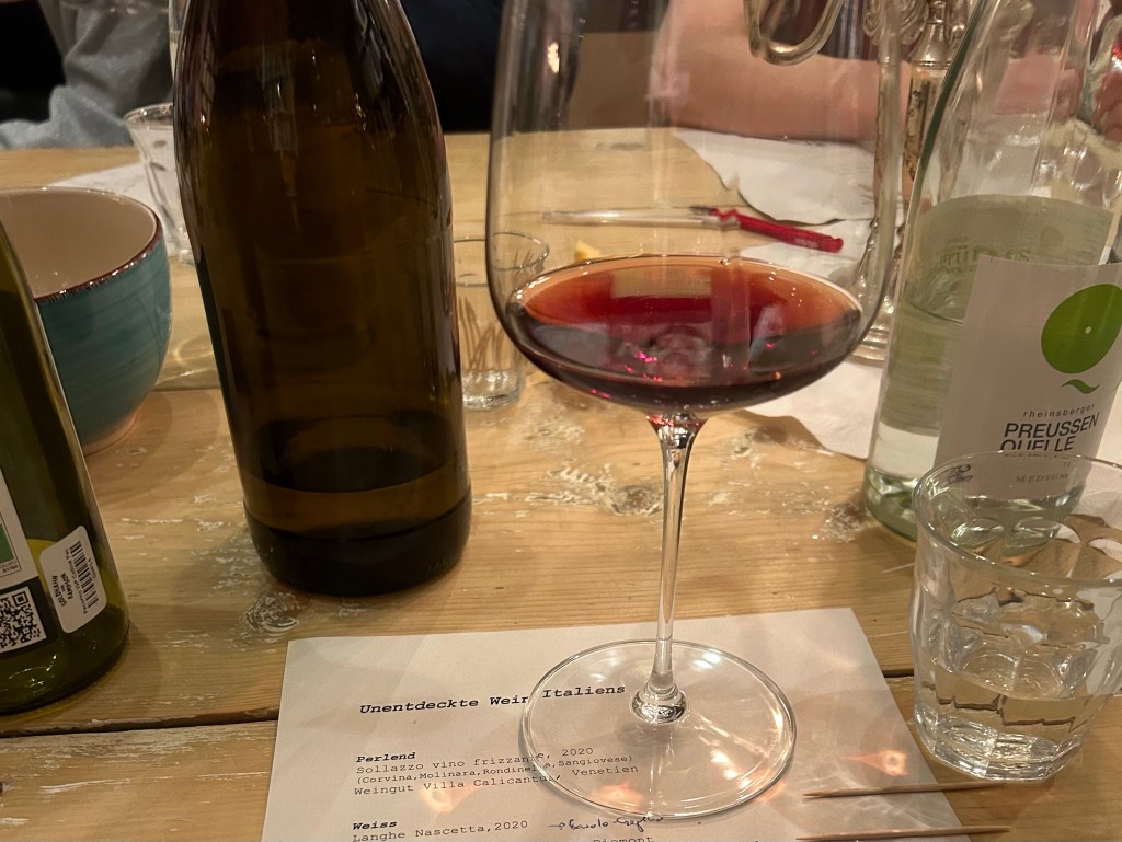 Das Publikum ist ein wenig so, wie man sich das in einem teuren Lebensmittelladen im Prenzlauer Berg so vorstellt – mit viel zur Schau getragenem Vor- und Halbwissen. Der Sommelier selbst ist hingegen sehr sympathisch, kennt sich aus und moderiert gut gelaunt durch den Abend. Am Anfang fremdeln wir noch ein wenig mit dem Gesamt-Set-up, aber der Wein hilft und beim zweiten Glas – dem Favoriten des Abends, bei allen, ist auch der Liebste aufgetaut und hat Spaß. Wir beginnen mit einem perlenden Naturwein aus dem Veneto – von den Rebsorten her eine Mischung aus Corvina, Molinara, Rondinelle und Sangiovese.