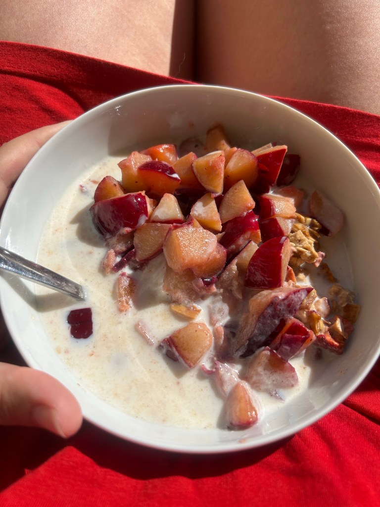 Hui, was war die letzte Woche – oder gar die letzten Wochen – schon wieder stressig. Und das so kurz nach dem Urlaub. Sehnsüchtig blickte ich seit Tagen auf diesen Sonntag und räumte ihn immer freier von Verpflichtungen. Schließlich wurde es ein Sonntag, wie er im Buche steht. Es beginnt mit hervorragendem Durch- und Ausschlafen, brutto fast neuneinhalb Stunden, netto nur wenig weniger. Dann ausgiebiges Herumtrödeln im Bett, bis der Hunger mich heraustreibt. Nach 11 stehe ich in der Küche und am Herd, denn die Freitag gelieferten Pflaumen sind noch ziemlich hart. Also schnipple ich ein paar davon klein, dünste sie mit Zimt in Butter und tue das Gemisch dann über mein Müsli, das ich im Nachthemd im Liegestuhl auf dem spätsommerlich heißen Balkon frühstücke.