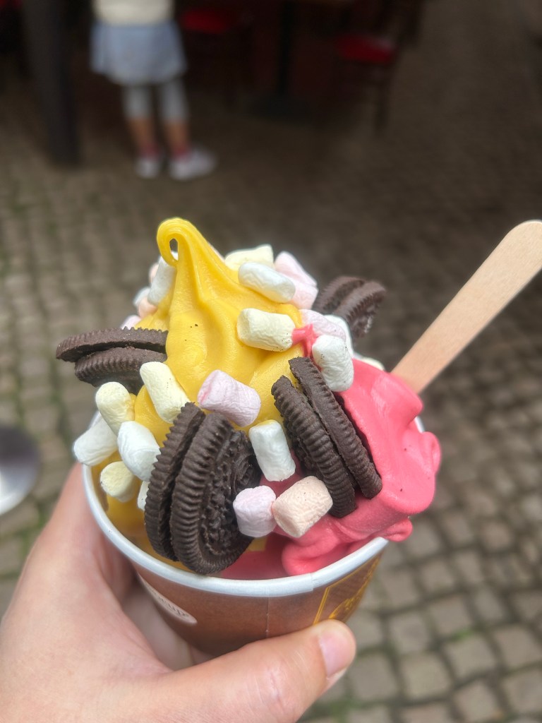 Nach dem Frühstück schafft der Liebste dann Platz im Keller für die Mitbewohnerin, während wir drei anderen uns auf einen Shoppingtrip in die nahegelegenen Einkaufsstraße begeben. Die Liebstenmama hat beim Wandern im Weinberg eine Weste verloren und braucht Ersatz, das Teilzeitkind bekommt bei der Gelegenheit eine eigene Weste und ich assistiere beiden beim Aussuchen, nachdem ich nach ausführlichem Gucken beschlossen habe, nichts zu brauchen. Hinterher sind wir zufrieden und genehmigen uns in der Cremeria jeweils ein Softeis.