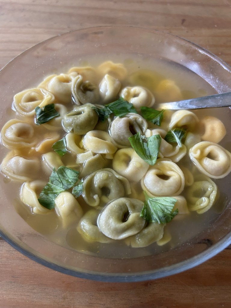 Der Mitbewohner kocht mir eine brodo vegetale, die seine Nonna immer für ihn gemacht hat, wenn er krank war. In dem Fall enthält sie Zucchini, Möhren, Kartoffeln und Tomaten, dazu gibt es Risoni, Parmesan und Olivenöl. Sehr lecker!