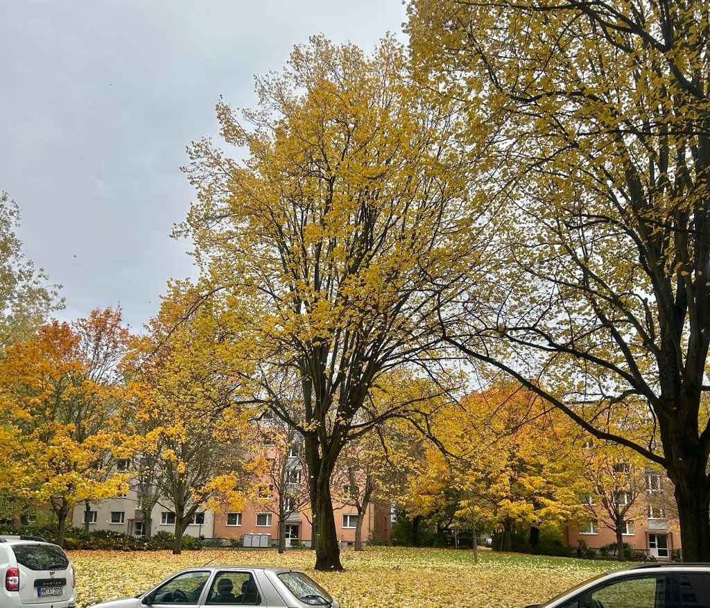Es ist windig und die bunten Blätter schneien sozusagen von den Bäumen. Nach genau einer Stunde bin ich zurück im Büro und mache mir mein Mittagessen warm, das ich dann Schreibtisch esse – es trägt auch Herbstfarben.