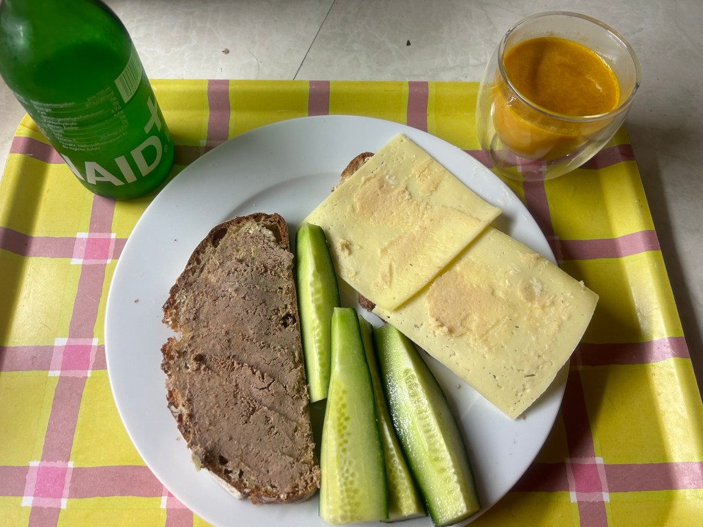 Auf dem Heimweg in der Tram mache ich Duolingo und Babbel und verpasse darüber meine Haltestelle, so dass ich dann etwas weiter laufen muss und noch ordentlich nass werde. Aber ist OK. Zuhause kurzes Abklatschen mit dem Mitbewohner, der zu einem Geburtstag los muss. Dann packe ich meine Sachen aus und das Paket mit dem Sanddornsaft. Den gibt es direkt in Heiß zum Abendbrot, dazu Stulle mit Käse und Apfelmeerrettich bzw. mit Hiddenseer Wildschweinleberpastete und eine Feierabendlimo.