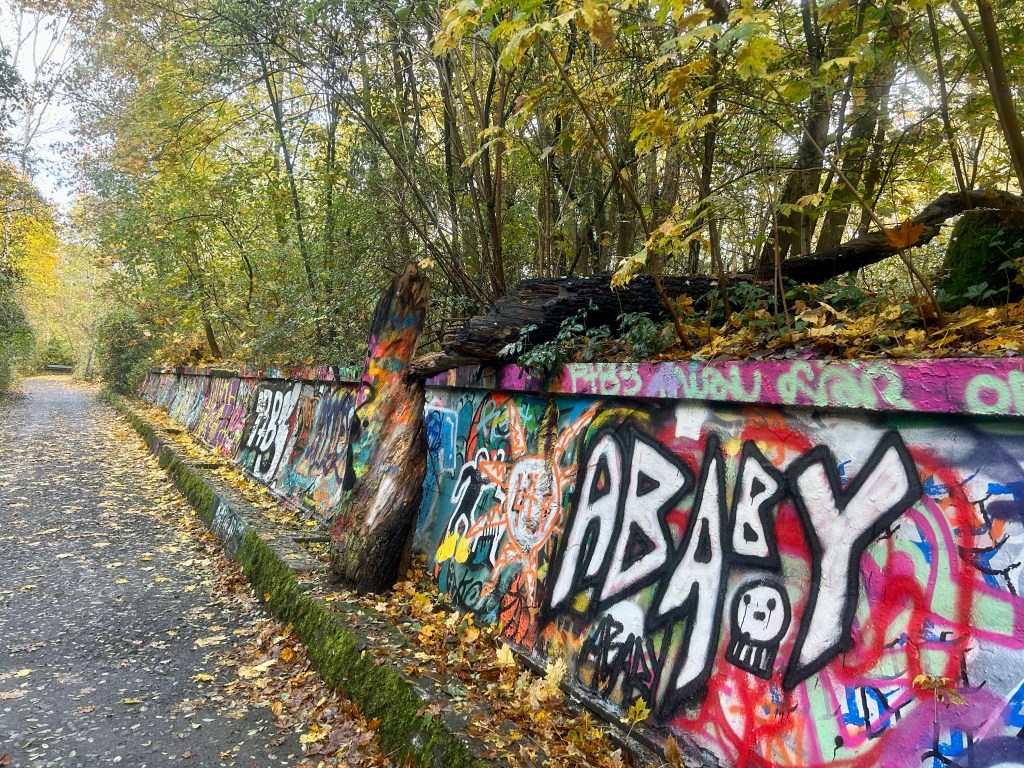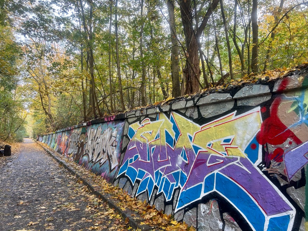 In dem Naturpark geht es viel über ehemalige Bahngleise, die sich nach und nach der Wald zurück holt, und an einem Ort vorbei, wo man sich mit Graffiti austoben kann.