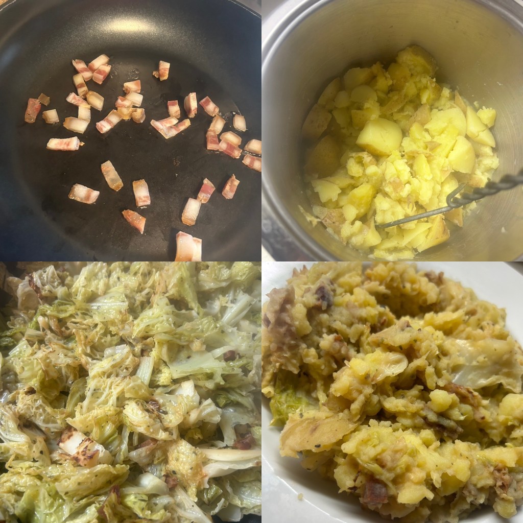 Ich lese das Internet leer, bediene die drei Italienisch-Apps, mache Wordle und Connections, telefoniere mit dem Liebsten und mache mir dann ein spätes Frühstück. Es gibt Käsebrot und hartgekochte Eier mit Sardellenpaste, eine Kaki und eine Birne, Sanddornsaft und Pfefferminztee mit Ingwer, Honig und Zitrone. Danach blogge ich und nehme dann mein Buch zur Hand und lese es aus – „Beyond that, the Sea“ von Laura Spence-Ash. Kommt aus dem Arbeitsbuchclub und liest sich gut weg, gegen Ende mit viel Rührungstränen. Als das Buch aus ist, mache ich mir ein frühes Abendbrot und bastle aus Guanciale, Kartoffeln und Wirsing einen irisch-italienischen Colcannon.