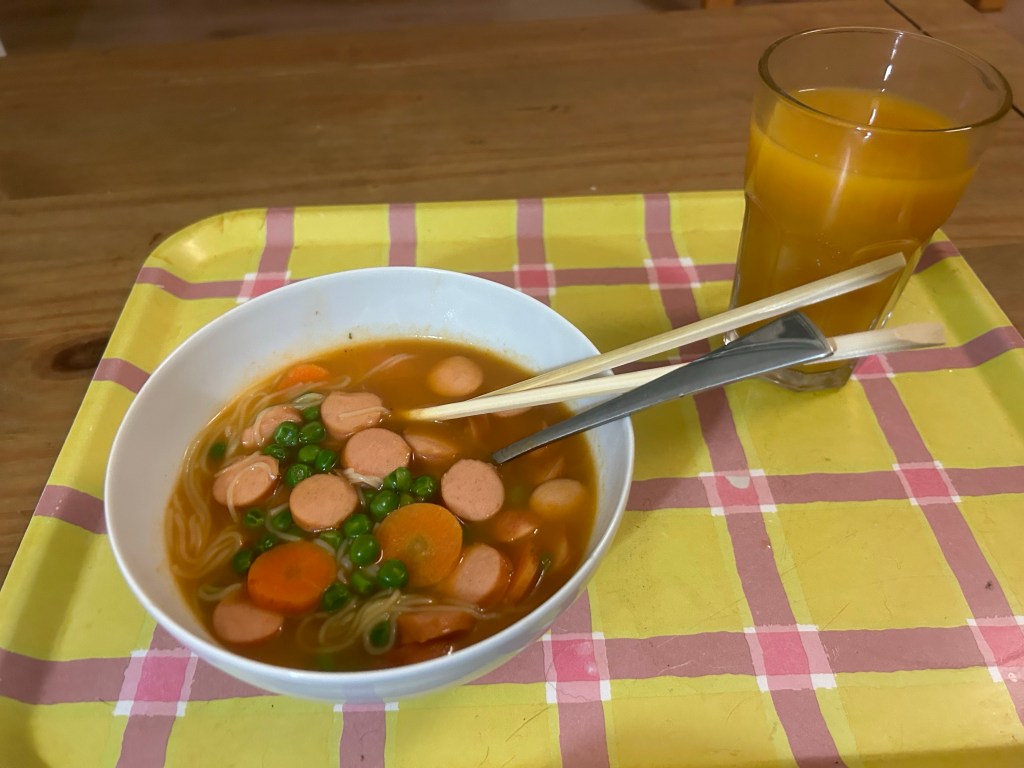 Dort ist heute eine neue Teilnehmerin dabei und während wir noch auf die Lehrerin und einen weiteren Teilnehmer warten, quatschen wir eine Runde über dies und das. Die Yoga-Session selbst ist mal wieder sehr gut. Ich habe schon davor bemerkt, wie mein Körper vor lauter Anspannung anfängt, zu schmerzen und steif zu werden – die Erkenntnis wird bei den Asanas immer deutlicher, auch wenn ich bis auf eine alle ausführen kann. Immerhin weiß ich jetzt, dass vielleicht auch mein Kranksein in den letzten Tagen von Stress und Anspannung beeinflusst wurde. Körper says „Au“. Auf dem Heimweg höre ich Bill Gates bei Trevor Noah und telefoniere dann ab dem letzten Stück wieder mit dem Liebsten. Das tue ich dann auch, während ich mir ein schnelles Süppchen koche – Gemüsebrühe gewürzt mit Gochuang-Paste, Reisnudeln, Möhren, Erbsen und dem Rest Bio-Würstchen. Deutsch-asiatische Fusionküche, sehr aufheizend.