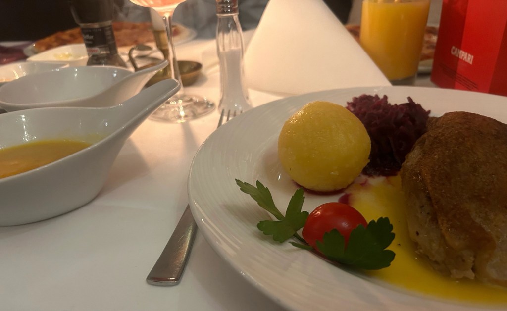 Zum Abendessen kehren wir nach langer Zeit mal wieder beim Stammitaliener ein – natürlich auch zu viert. Die Kids bekommen O-Saft und wir gönnen uns Campari Spritz bzw. Negroni sbagliato zu Bruschetta und Aufstrichen mit Brot. Dann gibt es für die Kinder Pizza Margherita und für Montepulciano d’Abruzzo zum italienischen Klassiker Gänsebrust mit Rotkraut und Klößen, für den Liebsten mit Braten-, für mich mit Orangensauce. Man muss ja die Gelegenheit nutzen, wenn man sie hat und Weihnachten wird es aus Gründen keine Gans geben. Es ist faszinierend: Das erste Stück Gänsefleisch („Gänsefleisch ma herkommen?“) im Mund und Zack ist Weihnachten. Es gibt wahrscheinlich kein anderes Essen, das für mich so eindeutig mit einem bestimmten Ereignis verbunden ist.