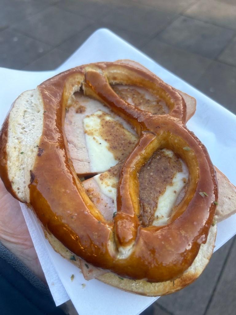 Nach dem Meeting noch schnell Telefonkonferenz mit Ostfriesland und Nürnberg zur Abstimmung einer E-Mail und dann geht das normale Arbeiten heute los. In der Mittagspause gehe ich nach draußen – inzwischen scheint die Sonne am blauen Himmel, sowas muss man nutzen – und hole mir auf dem inzwischen eröffneten Weihnachtsmarkt eine warme Breze mit Leberkäse und süßem Senf – nicht sehr weihnachtlich, aber genau das Richtige für heute.