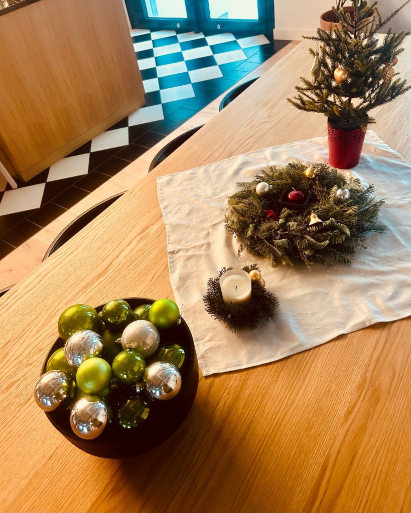 Gegen Mittag wird das da draußen ein veritables Schneegestöber mit viel Wind, so dass ich keine Lust auf den eigentlich geplanten Weihnachtsmarktbesuch habe. Stattdessen esse ich herumliegendes Obst, Kekse und Schokolade und dann hole ich mir einem Kollegen Weihnachten aus dem Lagerraum.