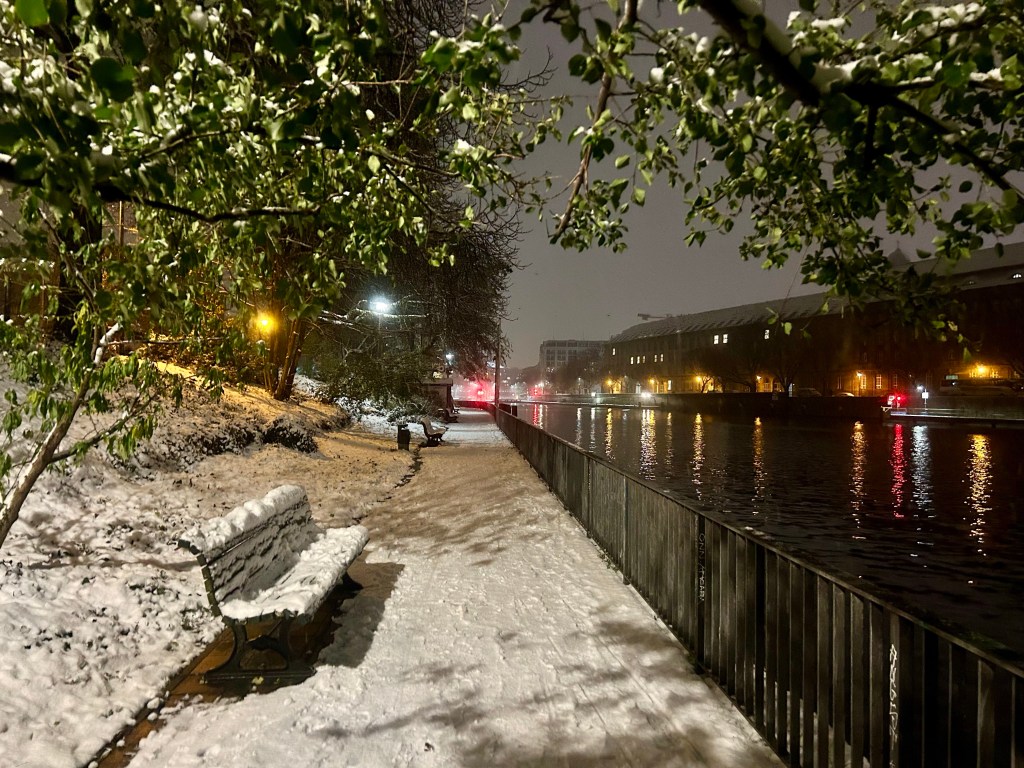 Irgendwann gegen 18 Uhr verlasse ich als Letzte das Büro und laufe dann durch den Schnee, der inzwischen dicht, aber sanft und gemütlich fällt, an der Spree entlang zu meinen Eltern und schaue nach Pflanzen und Briefkasten. Danach geht es mit U-Bahn und Tram nach Hause.