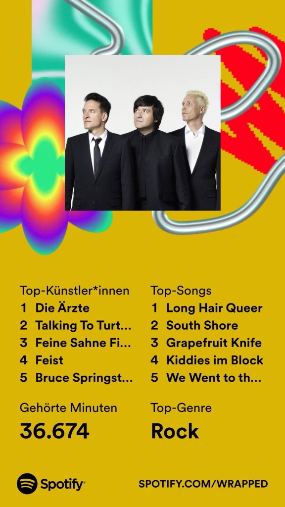 Der Nachmittag wird dann entspannter – Dinge abarbeiten, mit Kolleg*innen aus aller Welt Sachen koordinieren, den Spotify-Jahresrückblick durchgucken. Nicht wahnsinnig überraschend, aber wenn man so viele verschiedene Sachen hört wie ich (5471 Songs von 2309 Künstler*innen), werden dann auch kurze Phasen, in denen man an einer Band hängenbleibt gleich zu „meistgespielte Künstler*innen. Es ist also eigentlich nicht repräsentativ – vier davon sind welche, bei denen ich dieses Jahr halt auf einem Konzert war. Die dazugehörige Playlist ist es dann schon eher, auch wenn der Top-Song wie im letzten Jahr der ist, den wir in Kanada immer beim Losfahren hören, weil der Liebste darauf besteht.)