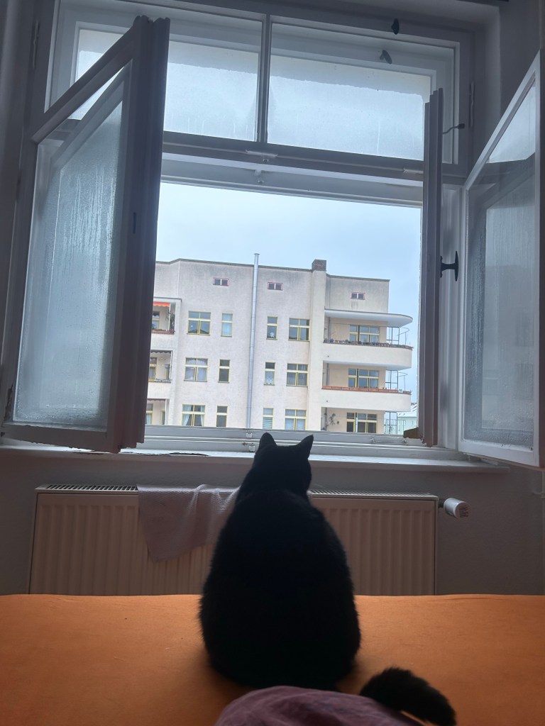Die Katzen bekommen Frühstück und frisches Wasser, ihr Klo wird durchgesiebt, eine Waschmaschine angestellt, die Pflanzen gegossen, die Küche aufgeräumt, zwei weitere Räume an ihren Fenstergummis mit Schimmelmittel behandelt, das Bett neu bezogen, die Wohnung gesaugt. Dann geht es in die Badewanne, um auch den Körper grundzureinigen. Bis zur Verabredung habe ich jetzt noch anderthalb Stunden, in denen ich Tee trinkend auf der Couch sitze, meine Haare trocknen lasse und in meinem Buch weiterlese, die Protagonist*innen haben gewechselt, jetzt geht es um Taxifahren, Essen liefern und Polizeidienste.