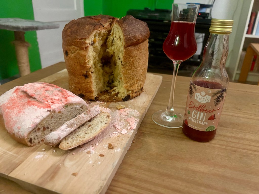 Ich hänge die Wäsche auf und setze mich dann mit dem Mitbewohner zum „Adventskaffee“. Ohne Kranz oder Kerzen, ohne Kaffee, aber dafür mit Pannetone (yummie!), Erdbeerstollen (meh) und dem Erdbeer-Gin-Mix, den ich heute morgen aus dem Adventskalender gezogen habe (yummie). Dann lese ich noch ein bisschen weiter, bis es Zeit ist, wieder aufzubrechen. Ich fahre mit heißem Tee, Tram und S-Bahn nach Mitte, laufe über die Spree und treffe meinen Cousin (das grenzt es wenig ein, ich habe viele davon) und seine Freundin in einem Restaurant, wo es Sushi und vietnamesisches Essen gibt – in sehr gut und kreativ!