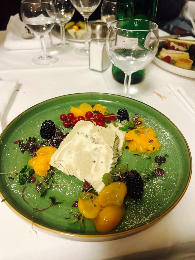 Die Schulung geht – mit Nachbereitung/Besprechung für morgen – bis 17 Uhr, da beginnt genau mein Teammeeting, an dem ich dann auch noch schnell teilnehme. Das geht bis 18 Uhr. Dann packe ich meinen Kram zusammen und fahre mit der U-Bahn bis zum Gendarmenmarkt, wo wir in kleiner Runde noch ganz schön teuer essen gehen. Der Liebste kommt auch dazu, was den Abend zusätzlich aufwertet. Ich esse Sauerbraten (laut Karte der Gewinner des „besten Sauerbratens“ von Deutschland) mit Apfelrotkohl, Spitzkohl und Kartoffelbrei und zum Nachtisch geeiste Kürbiskernmousse mit Zitrussalat. Die Vorspeise spare ich mir angesichts der Preise – ohne Geldgedanken hätte ich wohl den Tartar als Vorspeise genommen und zum Hauptgang das Kabeljaufilet auf frittierter Artischocke, aber das kam mir unanständig teuer vor und hätte zusammen nochmal 20 € mehr gekostet als meine Wahl.