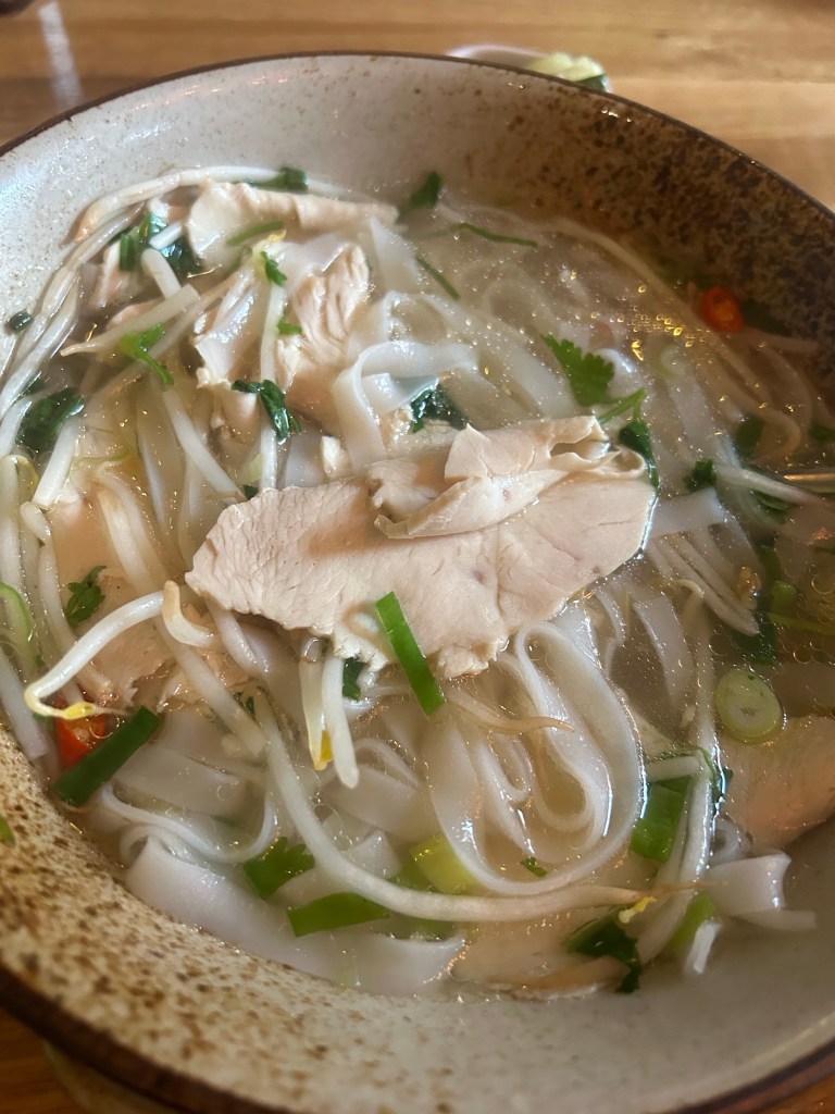 Ich wache schon kurz vor 6 auf, keine Ahnung warum. Das bedeutet, dass ich dann trotz aller Ruhe am Morgen ungewohnt überpünktlich das Haus verlasse, denn heute geht es ausnahmsweise schon an Montag ins Büro – es ist Schulungstag. Wir sitzen zu siebt im Schulungsraum, drei weitere sind hybrid zugeschaltet, der Rest ist krank (eine der Zugeschalteten auch, frisch positiv getestet, isoliert, aber noch nicht so krank, dass sie nicht zuhören kann). Zum Frühstück esse ich Pannetone und Clementinen, dazu jede Menhe Tee. Zum Mittagessen gehen wir zum Vietnamesen um die Ecke und ich bestelle mir eine Pho mit Hähnchen – mit Tofu muss ich wegen Histamin aufpassen, Garnelen mag ich nicht so und Hähnchen ist besser fürs Klima als Rind (dafür leiden Rinder wahrscheinlich weniger als Hühner in der konventionellen Tierhaltung – es ist schwierig).