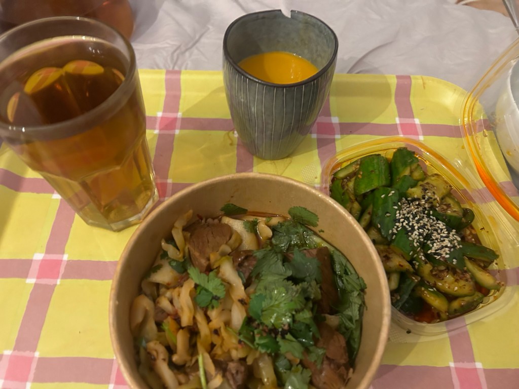 Ich melde mich von der Arbeit ab, gucke dann ein wenig im Internet umher und schaue mir die Aufzeichnung eines Webinars aus dem Adulting-Projekt an, das ich am Sonnabend verpasst hatte. Danach kurzer Social-Media-Check, der mich auf die Idee bringt, mir Beef Noodles zu bestellen (Auf die vielen heute gekauften Sachen habe ich keine Lust…) Ich nutze die Gelegenheit, endlich mal bei Wen Cheng zu essen. Immer wenn ich da vorbeigehe, ist da eine lange Schlange, geliefert wird das Essen in weniger als 30 Minuten.