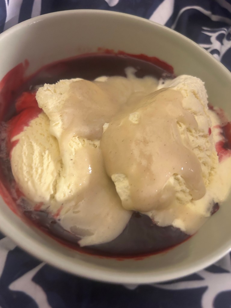 Ich schreibe zu 17 Uhr meinen Wochenbericht fertig, verabschiede mich im Teamchat bis nach Weihnachten und klappe den Arbeitslaptop zu und meinen privaten auf. Der Rest des Tages ist bestimmt von Fernsehen. „Feel Good“ zu Ende, fast die komplette erste Staffel von „My Life with the Walter Boys“ (Teenie-Dramen, what‘s not to love?), die erste Folge des LOL-Weihnachtsspecials. Dazwischen immer wieder die Katzen rein und raus lassen, mit dem Liebsten und dem Teilzeitkind telefonieren… Und zum Abendbrot gibt es ganz festlich Ofenkäse und zum Nachtisch Vanilleeis mit heißer Kirschgrütze und Zimt-Marzipan-Eierlikör. Irgendwann kurz vor Mitternacht fallen mir die Augen zu und ich gebe dem nach.