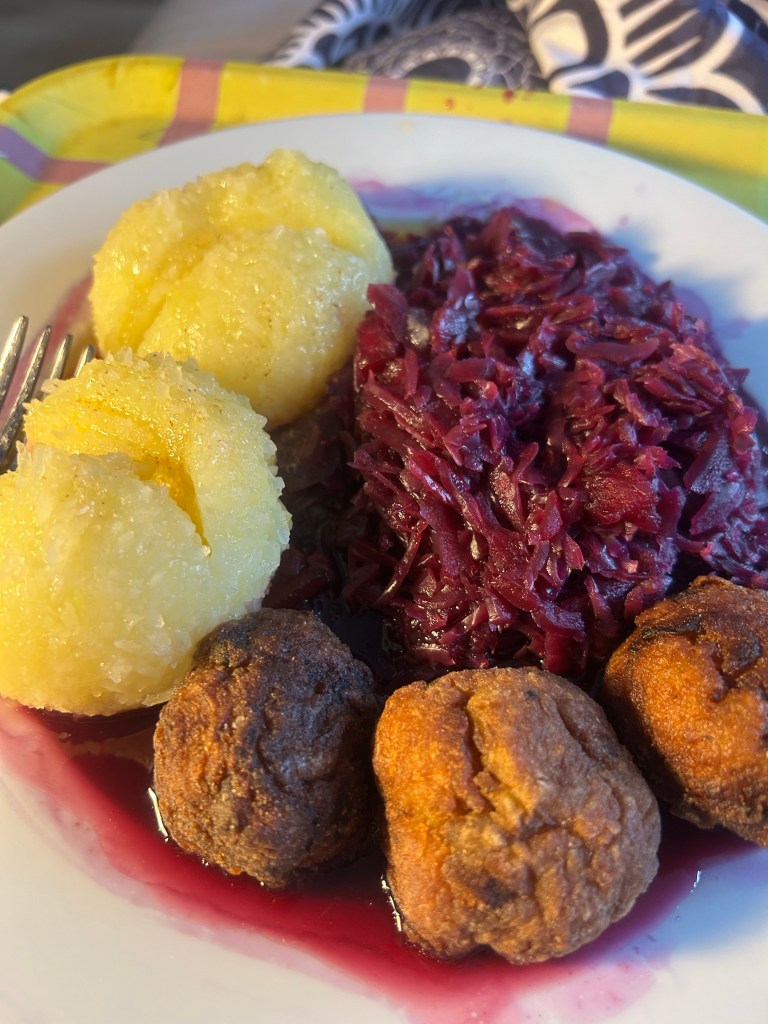Die gekauften Klöße und das gekaufte Rotkraut schmeckten beide erstaunlich gut, ich muss mir die Marken merken für unterjährige Gelüste oder zukünftige eingeschränkte Festlichkeiten. Dazu gab es Polpettone di melanzane, die der Mitbewohner gestern in stundenlanger Kleinarbeit zubereitet hat, und einen hieb zerlassene Butter. Ich war beim ersten Bissen selig, nach dem Essen genau richtig vollgefressen und schläfrig.