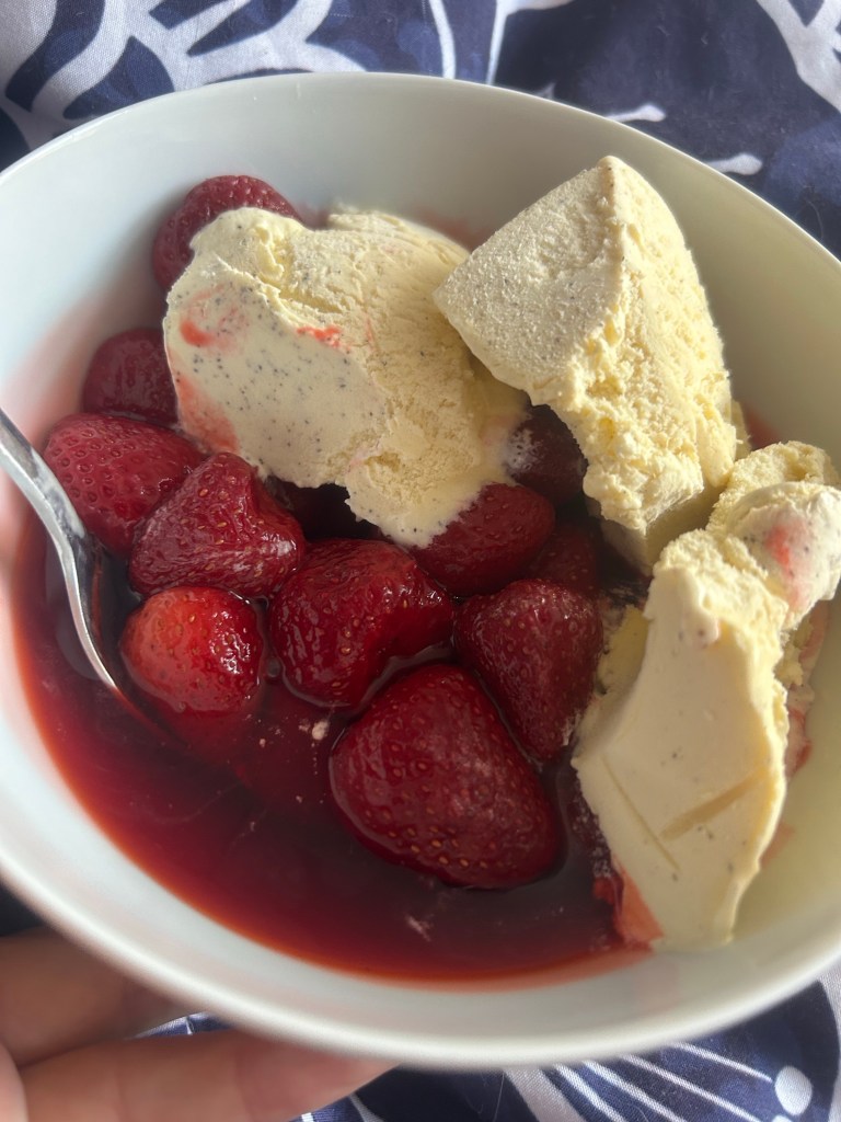 Während des Essens war tief im Westen das Teilzeitkind in einen Zug tief im Süden gestiegen, erste längere Alleinfahrt mit 10. Das ist aufregend, aber nicht mehr so sehr wie die weit kürzere erste Alleinfahrt zu Ostern, als es noch kein Handy hatte, die Sitznachbar*innen doof waren und der Zug ungeplant längere Zeit auf offenerer Strecke hielt. Diesmal alles ganz entspannt. Ich versuche, mir die Zeit mit Lesen zu vertreiben, schlafe dabei aber immer wieder ein. Als „Mittagessen“ gibt es dann eine weitere Weihnachtstradition – aufgetaute Erdbeeren vom Sommer, normalerweise mit Schlagsahne, bei mir heute mit Vanilleeis. Über die Tradition hatte ich mal im Schreibworkshop geschrieben, diese Erdbeeren habe ich am 16. Juli eingefroren.