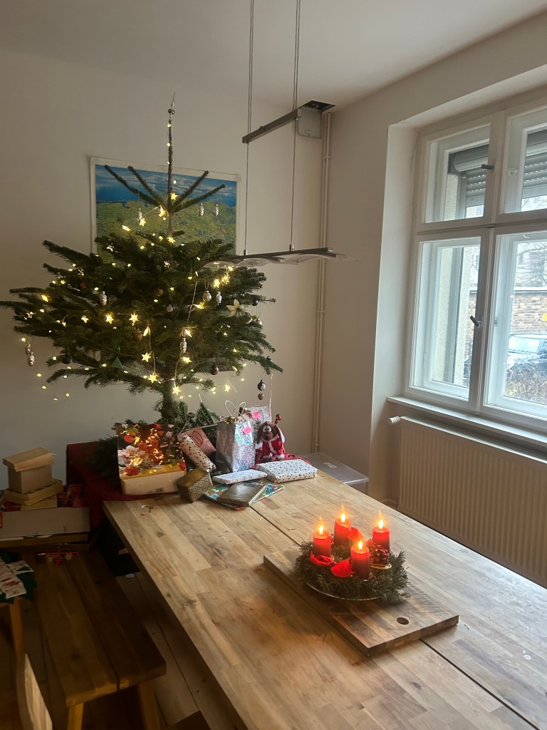 Der Liebste holt mich mit Kaffee am U-Bahnhof ab und hilft mir Tragen. Wir spazieren zu ihm nach Hause, legen Sachen ab und treffen die letzten Vorbereitungen für unser Weihnachten. Ich hänge den letzten Schmuck in den Baum – das Teilzeitkind hatte scheinbar mitten im Schmücken plötzlich was Anderes vor letzte Woche – und lege Geschenke darunter, stelle Plätzchenteller zusammen, entzünde die Kerzen am Adventskranz, es läuft Weihnachtsmusik (im Speziellen „Fairytale of New York“ und „Jingle Bells“, eher nichts mit Jesus und so) und dann liegen wir noch einen Moment auf dem Sofa und kümmern uns um das Größte meiner Weihnachtsgeschenke – ein Wochenende in einem Wellnesshotel an einem der Seen rund um Berlin. Nach einigem Hin und Her buchen wir schließlich eins für gleich in zweieinhalb Wochen und sind beide sehr glücklich und zufrieden damit.